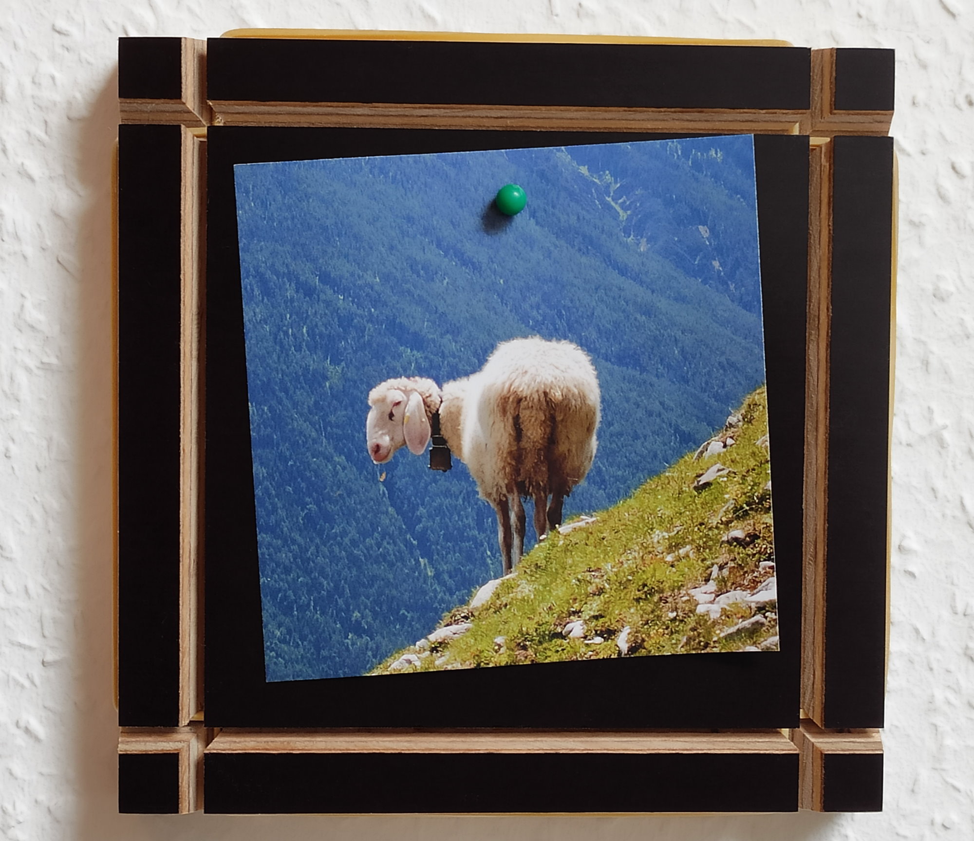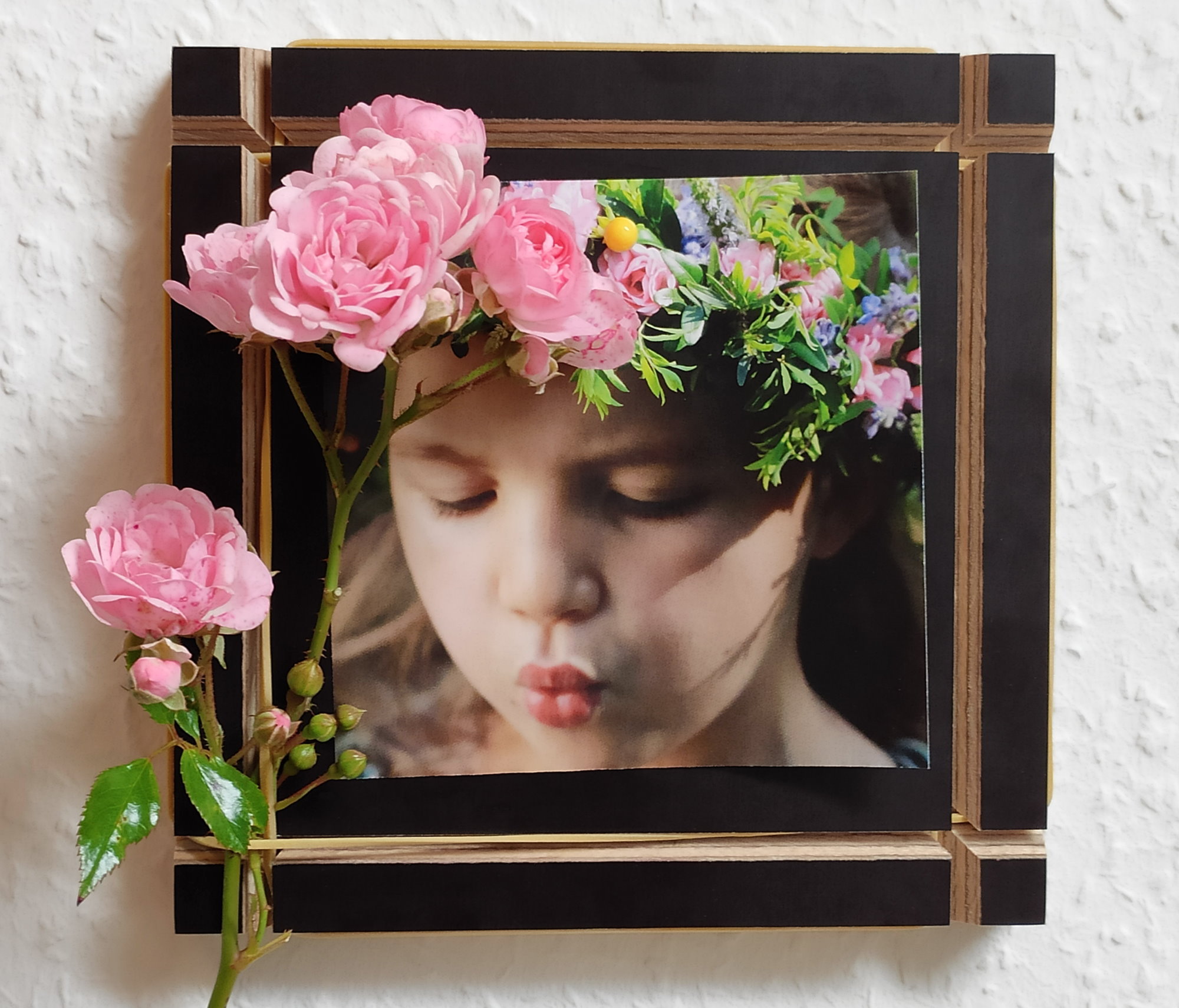 Zusätzlich sind als Verzierung schräge Einschnitte angebracht, welche die Schichten des Multiplex-Holzes sehr interessant zum Vorschein bringen. In den Nuten sind Marken-Gummibänder eingelegt, an diesen können kleine Accessoires, passend zum Bild angebracht werden. Füge eine Haarlocke dem Bild der Freundin zu, das Ticket zur letzten Urlaubsreise oder eine Feder von den Lieblingsvögeln, es gibt hier keine Grenzen. Somit erhält dein Bild eine einmalige Darstellung und bringt regelrecht Leben ins Blickfeld. Die Fläche zwischen den Einschnitten beträgt ca. 11,5cm x11,5cm.