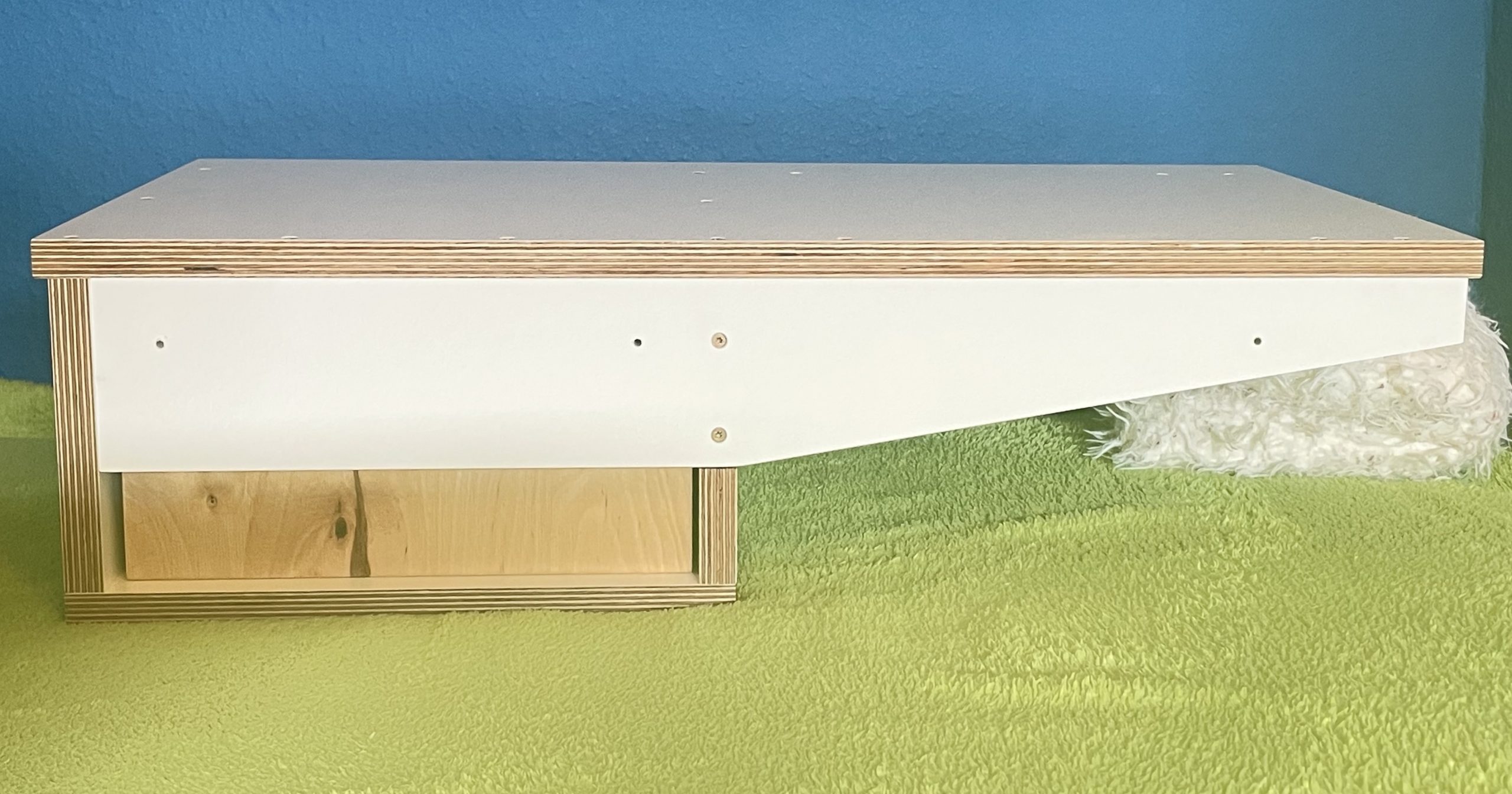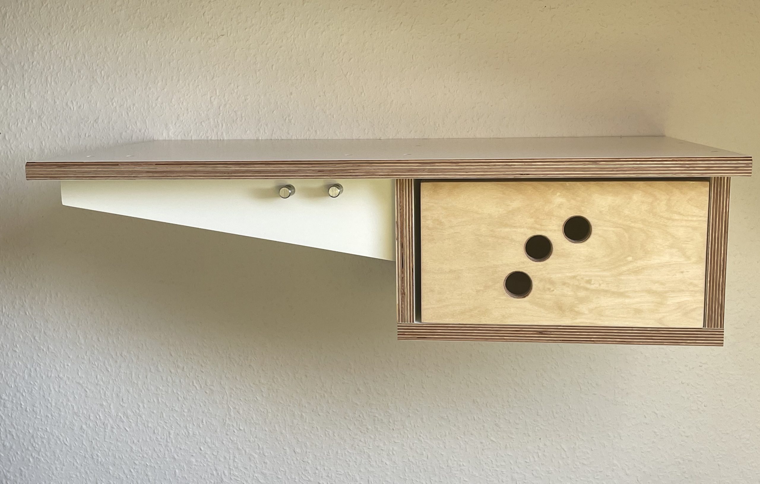 Die Garderobe ist aus edlem Multiplexholz weiss in 18mm handgefertigt. Die Schublade ist aus geöltem Multiplexholz in 15 mm. Die Aufhängung für die Klamotten ist eine 25 mm Alustange, da hält auch die dickste Kluft. Ganz edel an der Front auch die zwei Edelstahlknöpfe für die Schlüssel. In der Schublade kannst du alles unterbringen, was du sonst so hast.