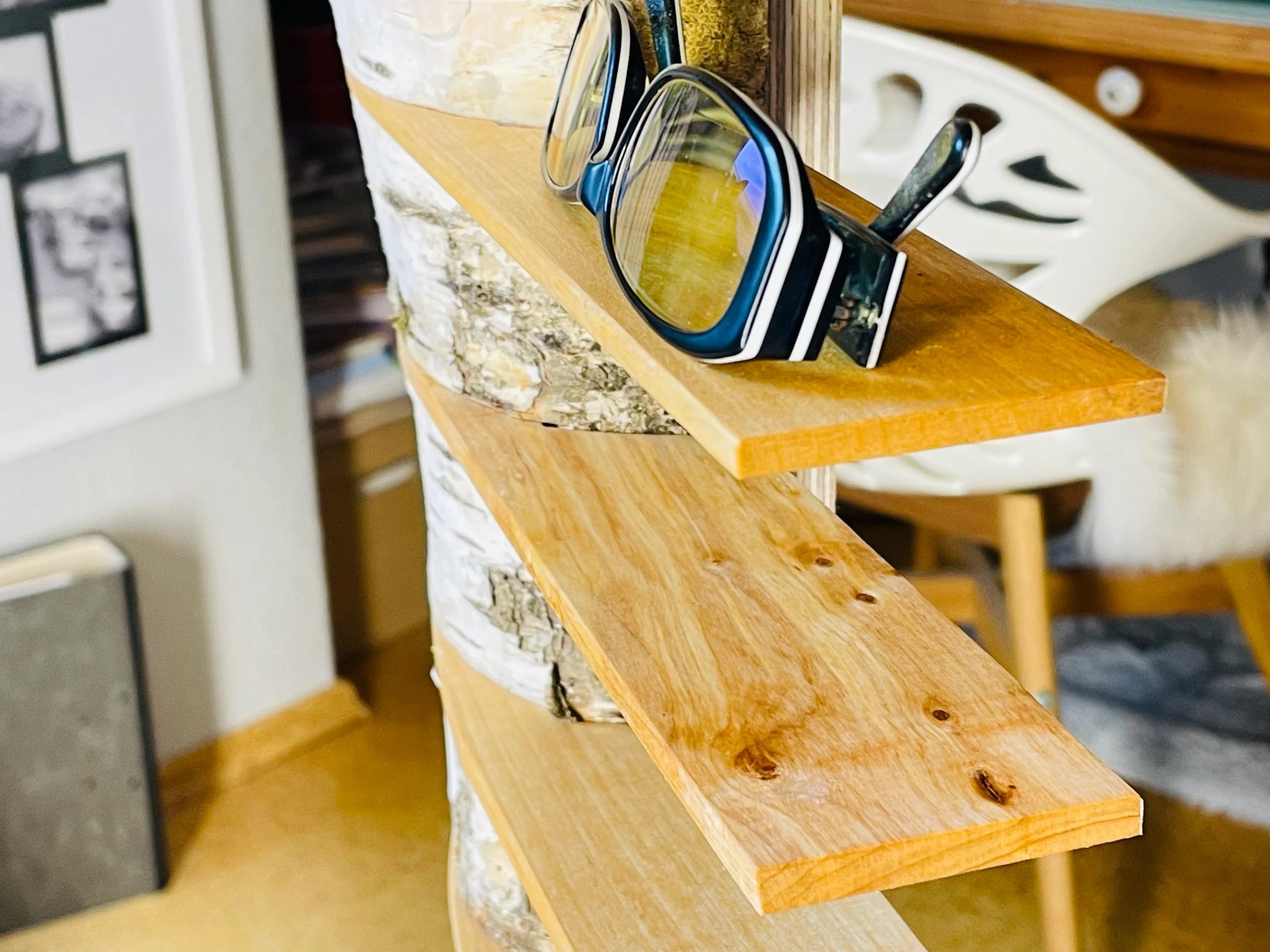 Die Brettchen sind mit Leinölfirnis behandelt, die Rinde des Birkenstamm ist komplett naturbelassen. Das Stämmchen wird sehr stabil mit zwei Schrauben an der Wand befestigt, so passiert deinen wertvollen Brillen nichts, wenn man mal versehentlich dagegen stößt.
