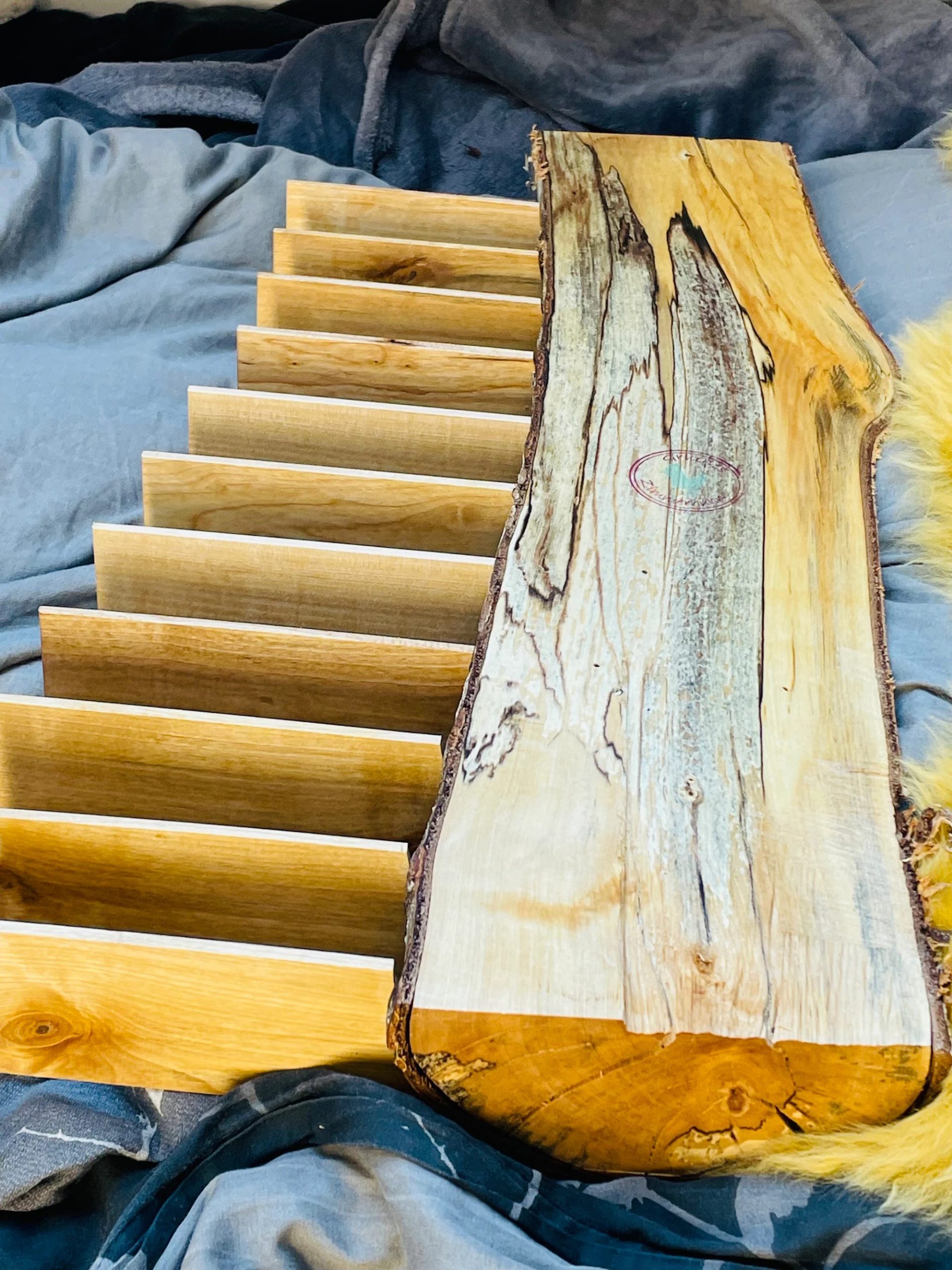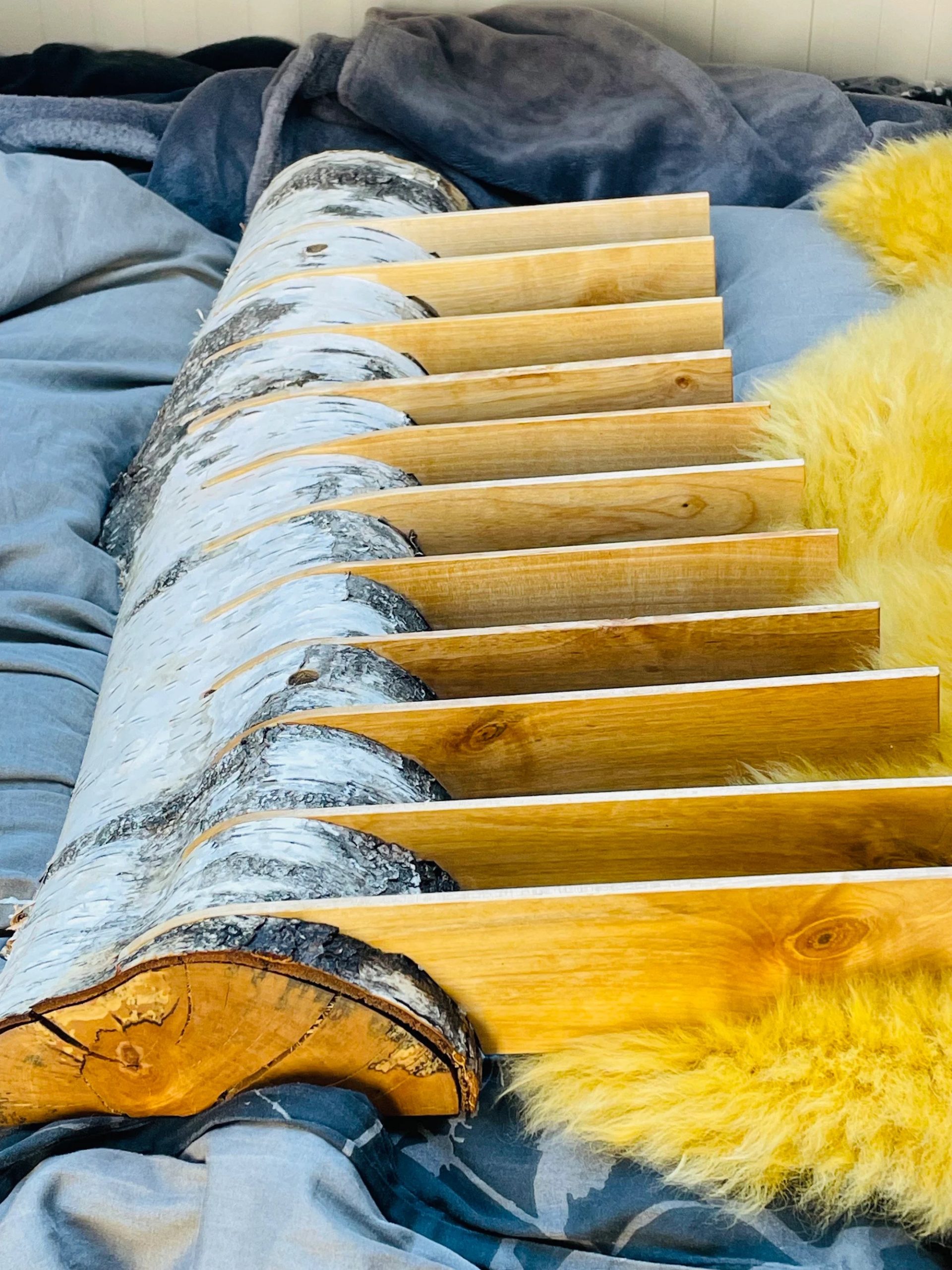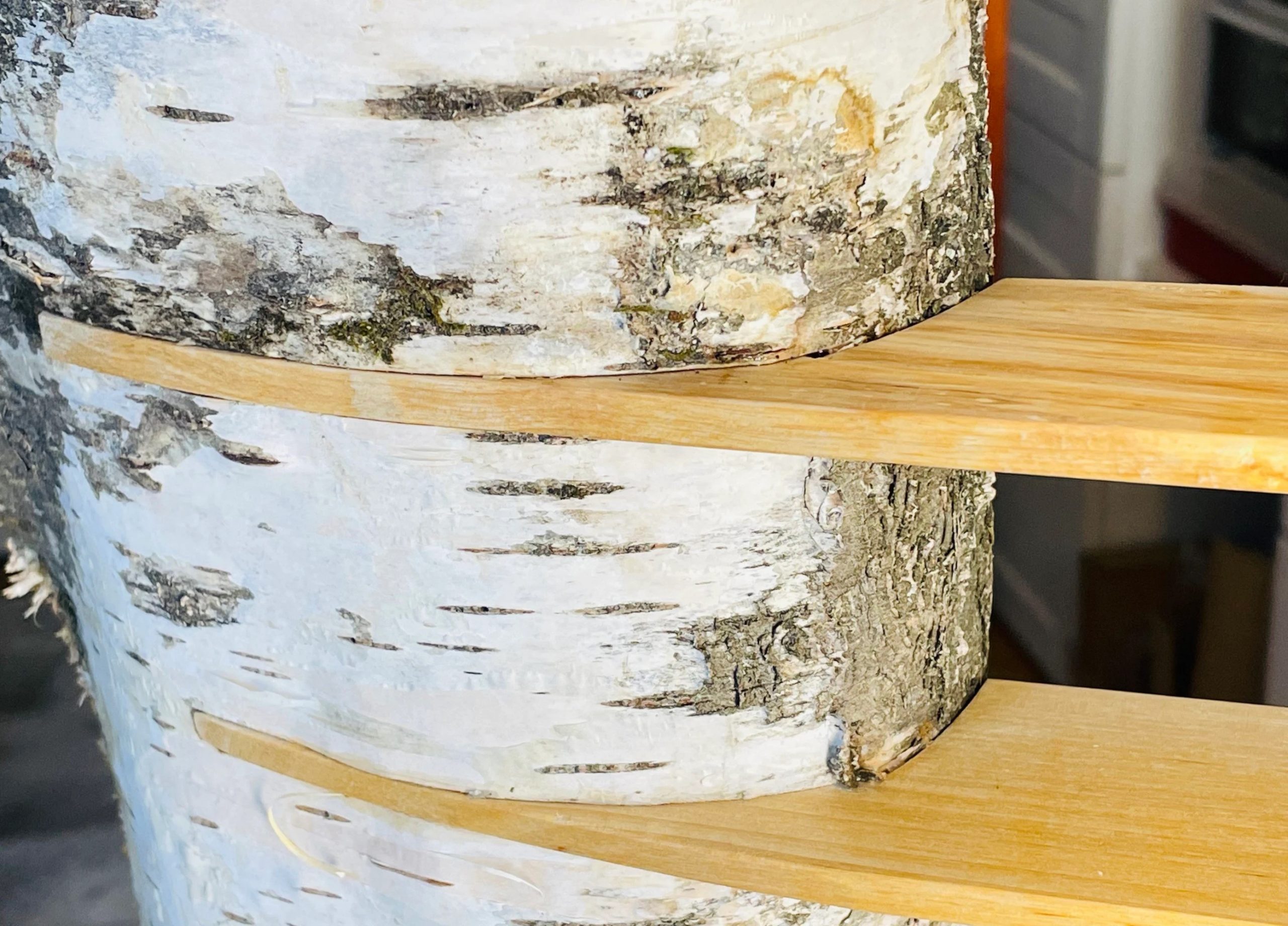 Das Stämmchen wurde halbiert, plan gehobelt und in einem aufwändigen Vorgang für die Brettchen vorbereitet. Die Brettchen sind ebenso aus Birkenholz, diese haben eine ganz feine und sehr warme, goldene Maserung, du wirst begeistert sein. Durch die seitliche Befestigung wird eine luftige und fast schwerelose Ansicht erzeugt, die Brettchen schweben geradezu in der Luft.