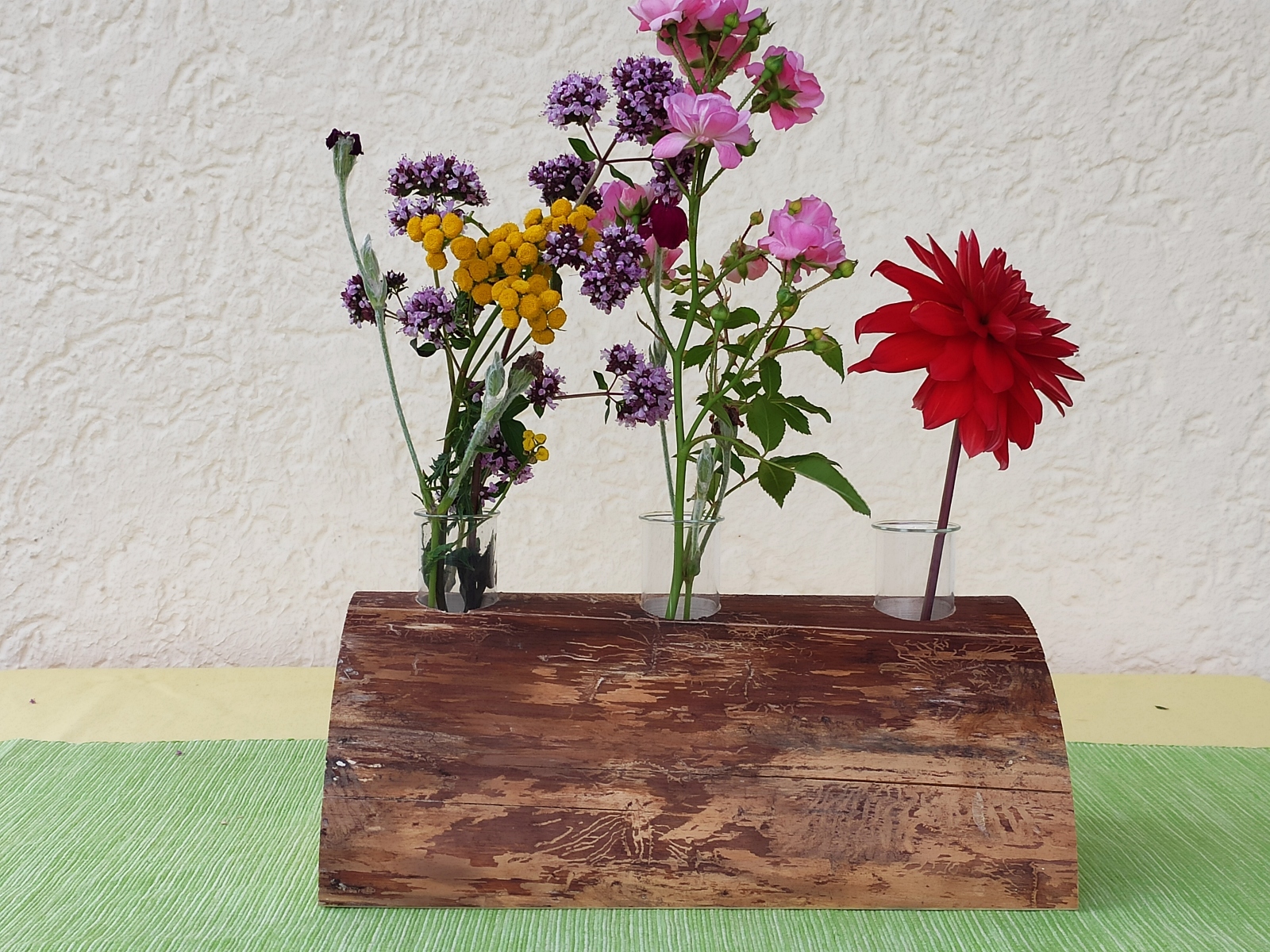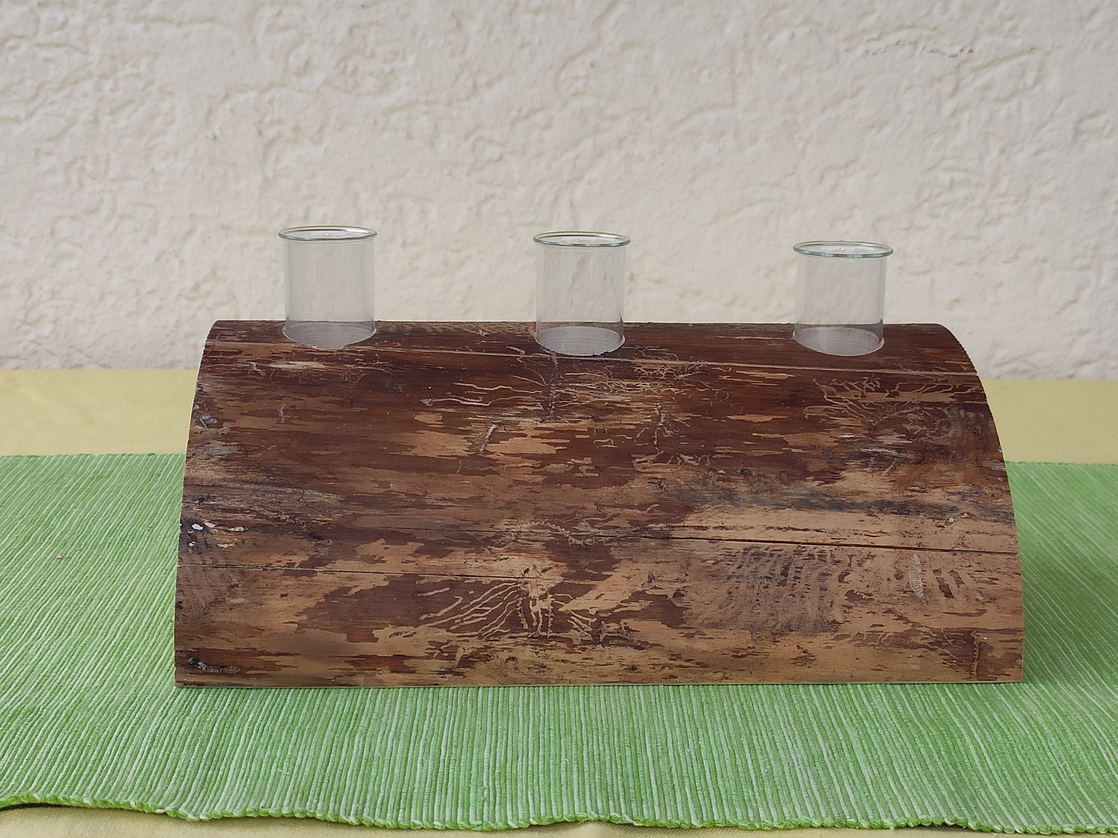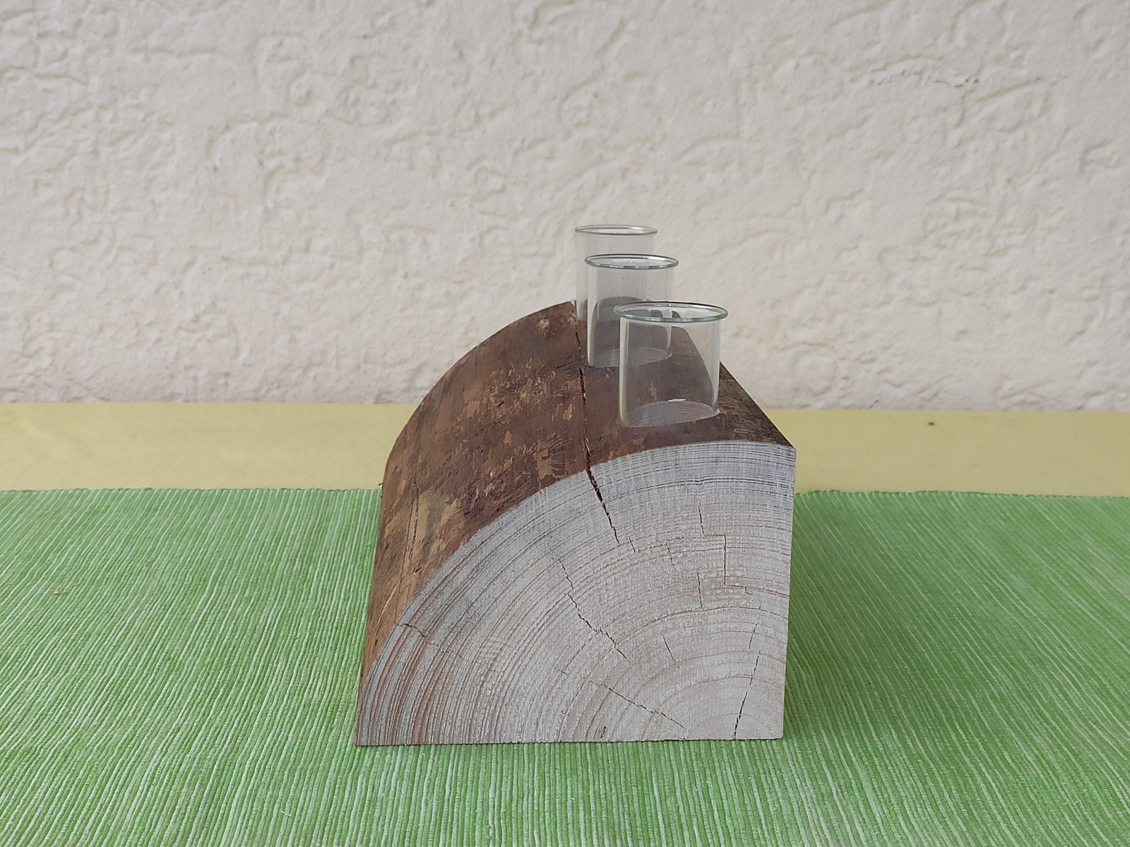 Das Holz ist aus dem lokalen Wald und von uns geholt und verarbeitet. Die Längsseiten sind handgehobelt, die Stirnseiten sind fein sägerauh. Die Oberseite ist die natürliche Fichtenoberfläche ohne Rinde. Die eingelassenen Reagenzgläser (Markenware) haben einen Aussendurchmesser von 30mm und sind ca. 100mm lang. Die Gläser sind nicht eingeklebt, sitzen aber sehr gut, können aber gut gewechselt werden. Die Oberfläche ist nicht behandelt. Die Blumenvase eignet sich durch ihre Art wunderbar zu einer natürlichen Einrichtung aber auch als Kontrast zu einer eher eleganten Einrichtung.