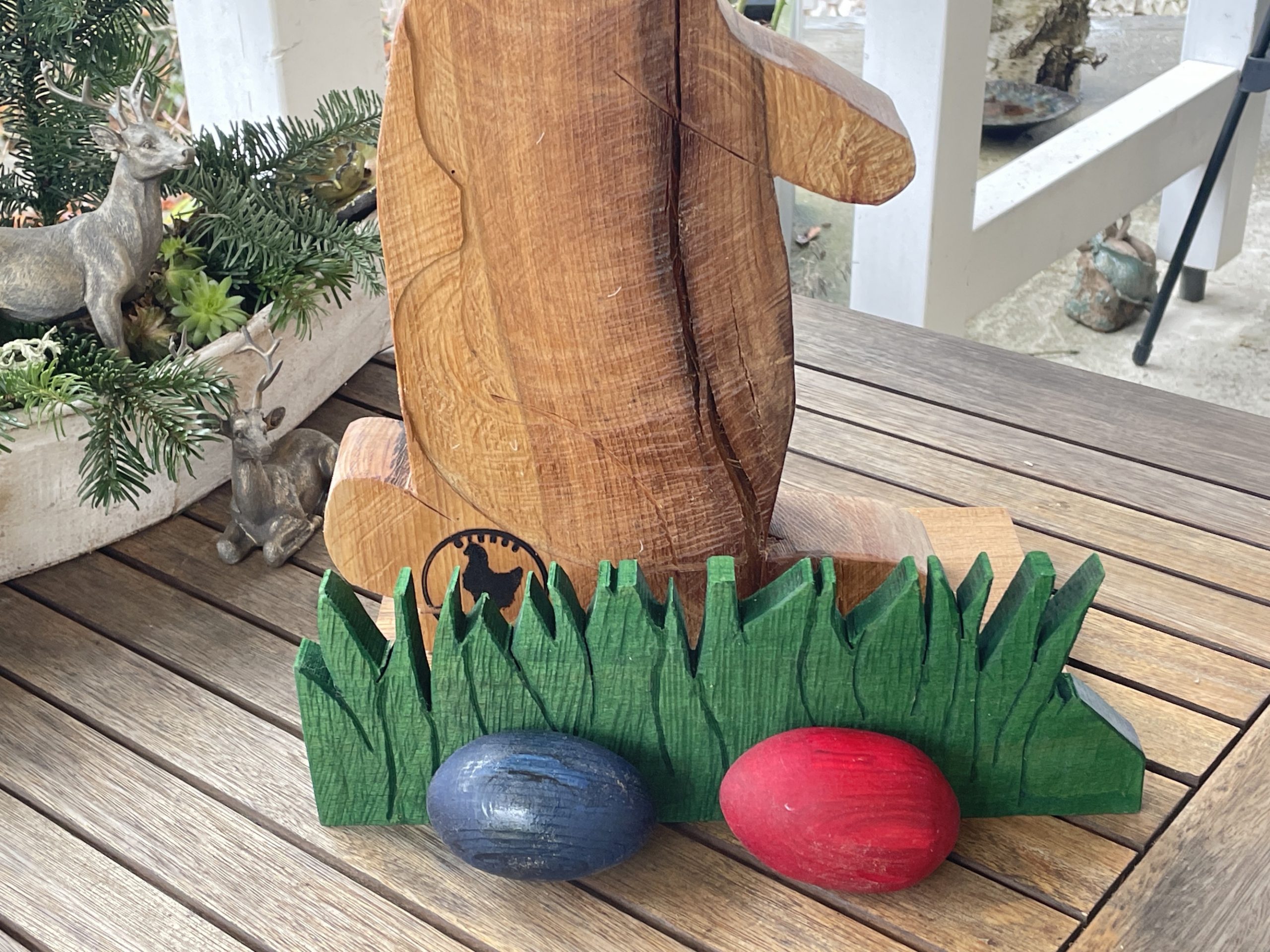 Ganz einzigartiger XL Osterhase aus massivem Buchenholz, optional mit Gras- und Eierdekoration. Das ist der geniale Blickfang in deinem Zuhause, egal ob in der Wohnung oder als Begrüßung für deine Besucher, alle werden diesen kleinen Freund begeistert anschauen. Lass ihn dir nicht entgehen, wir haben nur eine ganz kleine Serie von 4 Hasen.