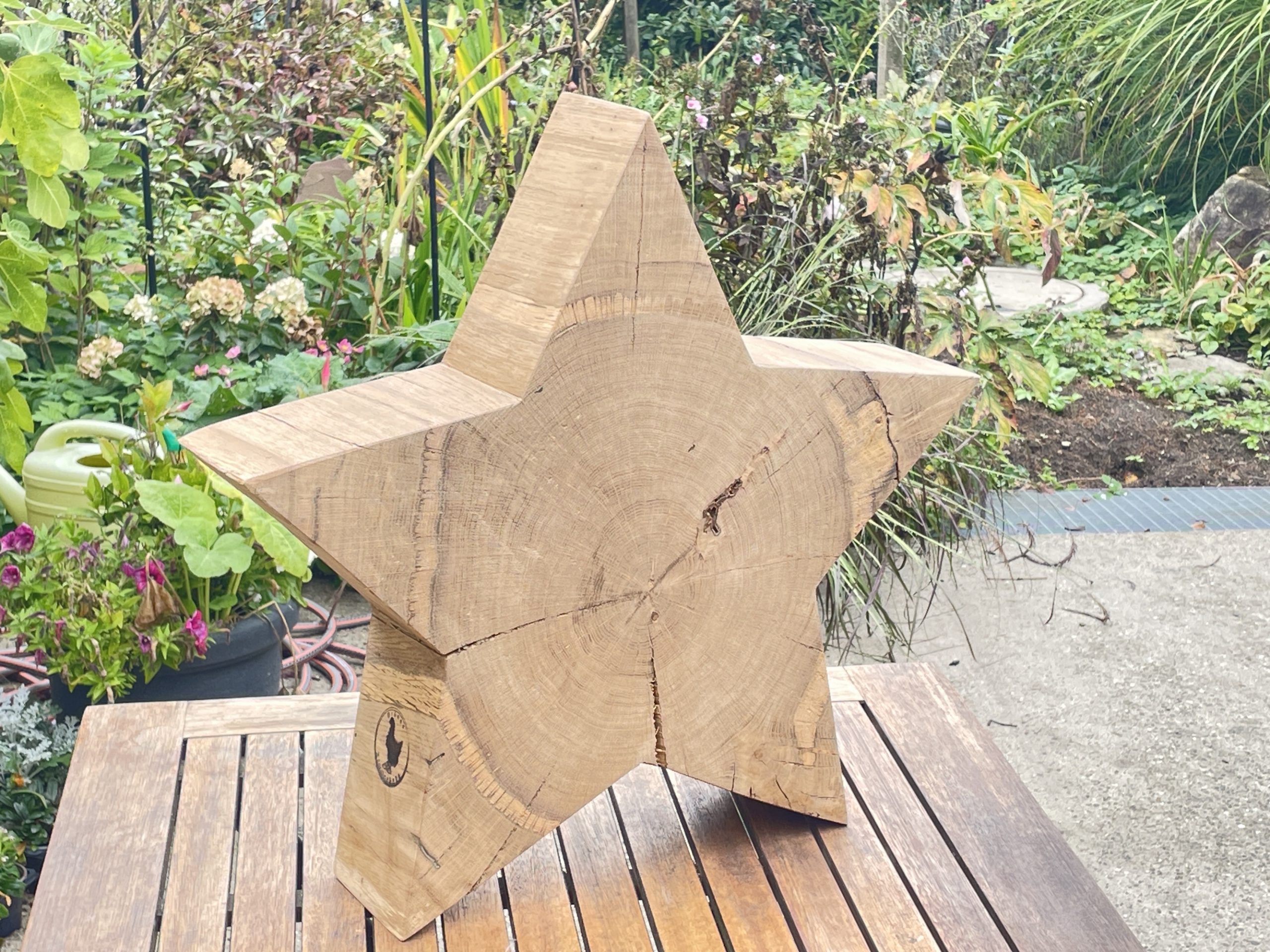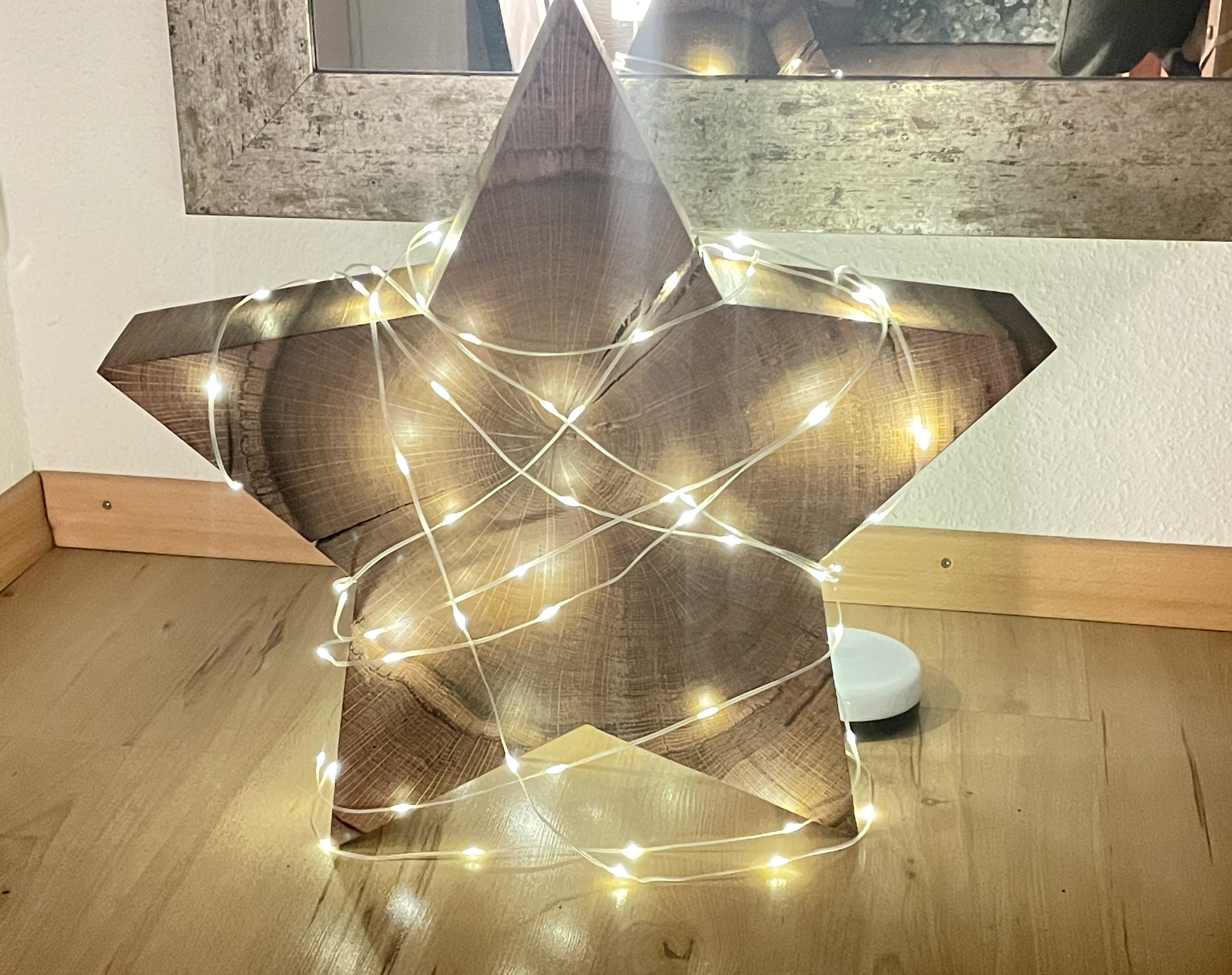 Wunderschöne, einmalige XXXL-Sterne aus Eichenholz, optional mit LED-Band. Das ist das besondere Stück in deiner Wohnungseinrichtung. Das Holz wurde selbst aus dem lokalen Wald geholt, die Baumscheiben exakt plan gefräst und dann sehr aufwendig feinst geschliffen. Somit konnte diese tolle Maserung der Eiche herausgearbeitet werden, es ist Balsam für die Augen. Hast du so schöne Sterne schon einmal gesehen?