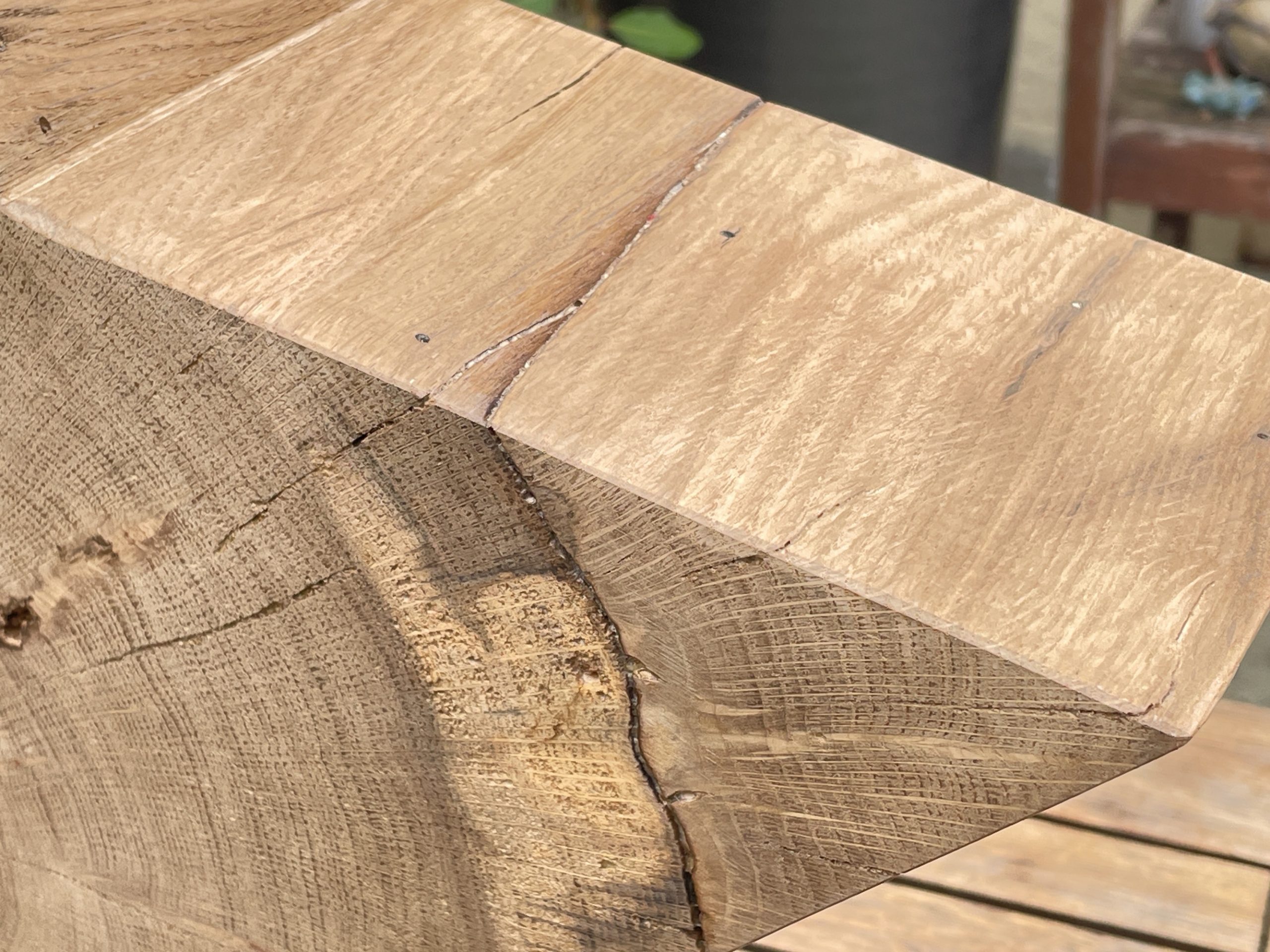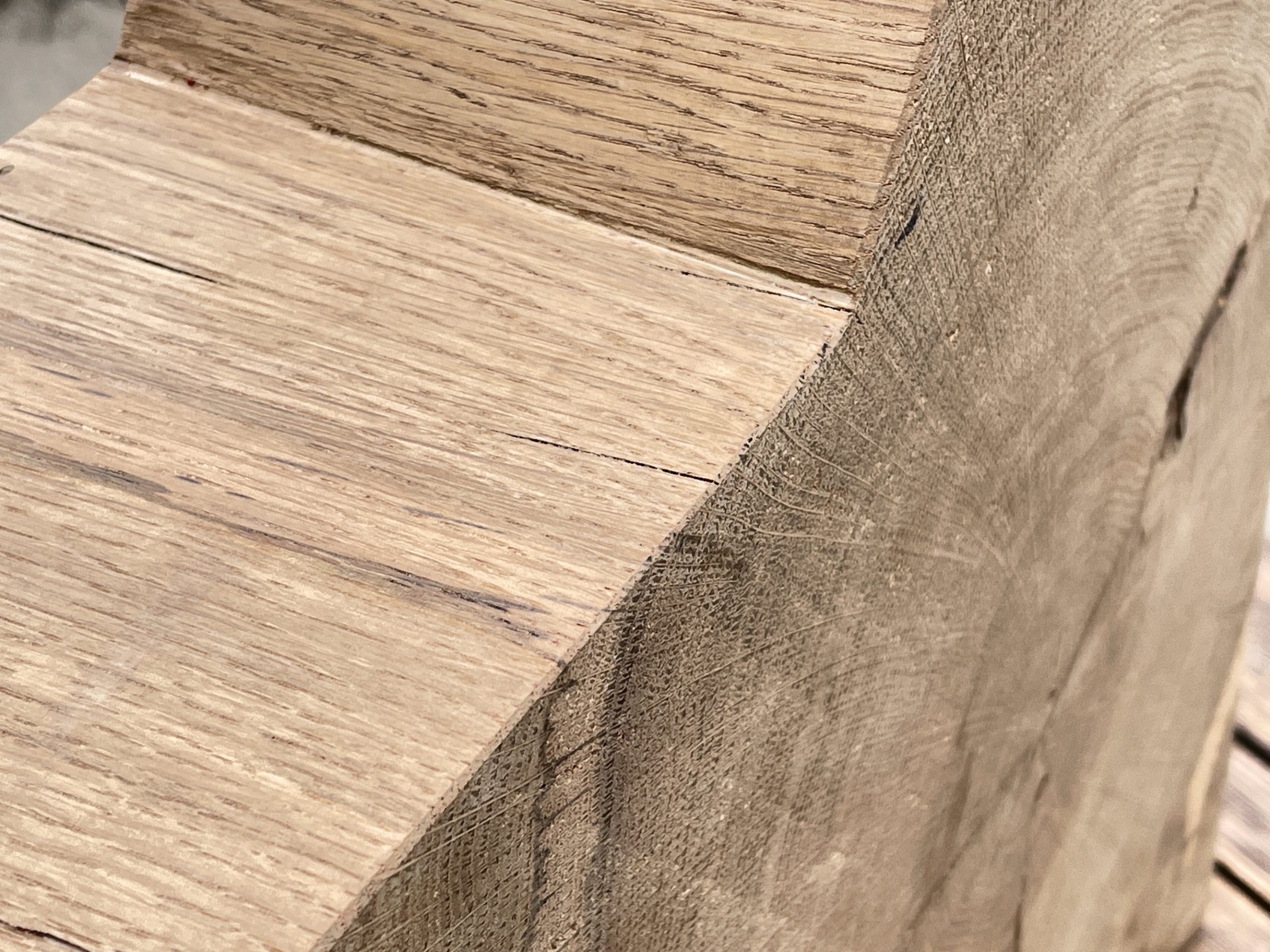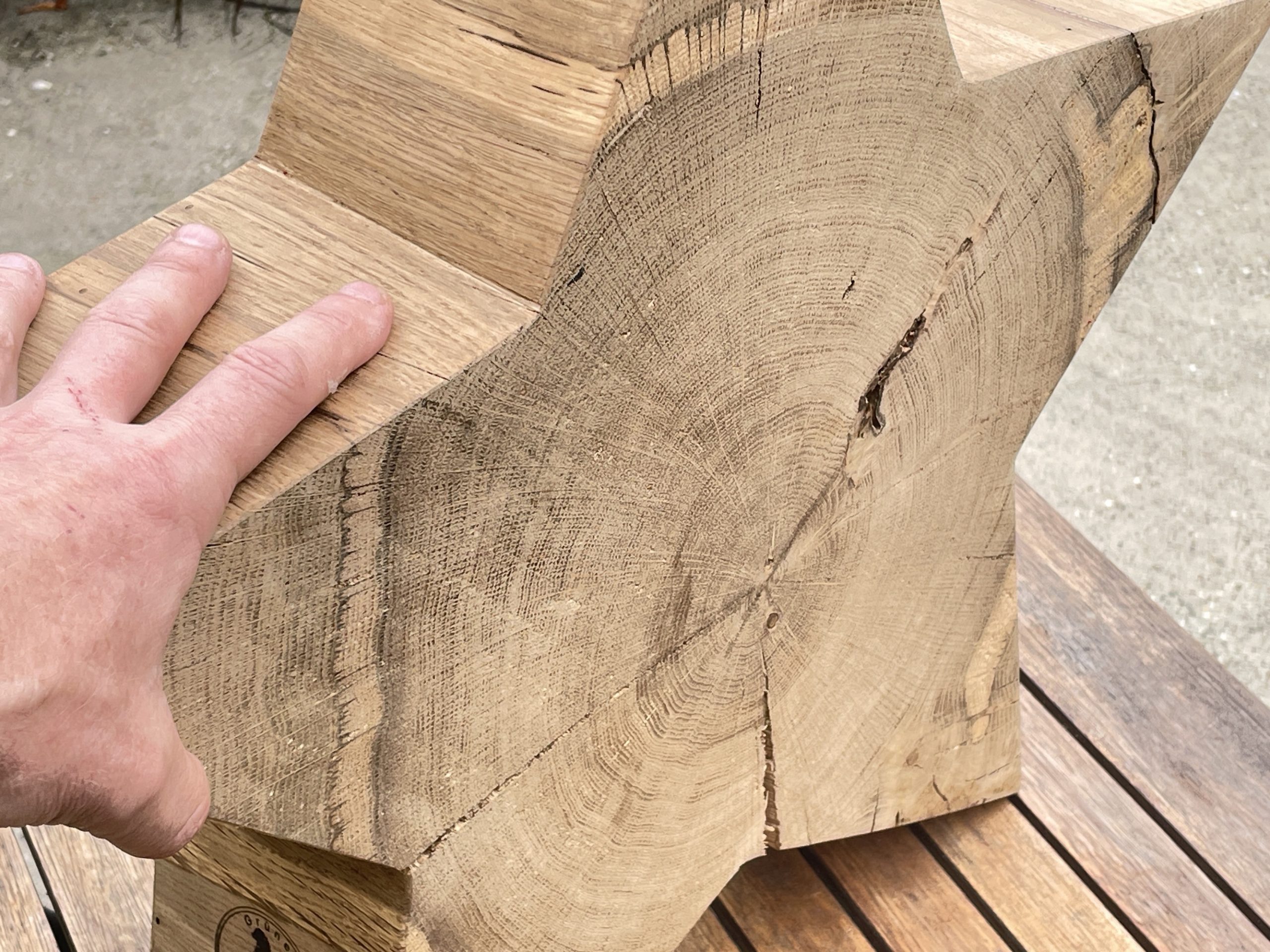 Und dann ganz besonders, die Oberfläche wurde geseift. Das ist eine sehr alte Handwerkskunst, die oft in nördlichen Ländern für Böden und Tische verwendet wurde, aber auch in alten Gaststätten wurden damit Tische und Theke damit behandelt. Damit erhält man die natürlich Farbgebung des Holzes und verfälscht diese nicht wie mit einem Öl. Zudem ergibt dies eine absolut zarte unvergleichliche Oberfläche, man könnte schon fast an einen Baby Popo denken. Ich kann mich erinnern, wie meine Mutter oft davon erzählte, als junges Mädchen in der Familiengaststätte immer die Tische mit Seifenlauge reinigen und pflegen durfte. Der zarte Geruch der Seife ist ihr immer noch präsent. Wir haben die Seife selbst hergestellt und in einem aufwendigen Verfahren aufgebracht. Es gibt quasi nirgends geseiften Stücke, geschweige denn Sterne und dann in dieser Größe.
