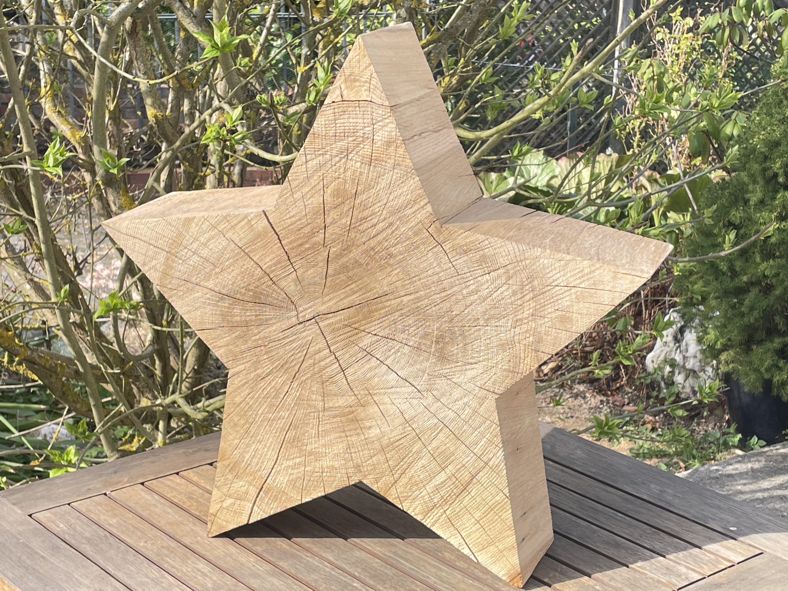 Wunderschöne, einmalige XXL-Sterne aus Eichenholz, optional mit LED-Band. Das ist das besondere Stück in deiner Wohnungseinrichtung. Das Holz wurde selbst aus dem lokalen Wald geholt, die Baumscheibe aufwändig gebürstet. Somit konnte diese tolle Maserung der Eiche herausgearbeitet werden, es ist Balsam für die Augen. Hast du so einen schönen Stern schon einmal gesehen? Das ist das ganze Jahr über der Hingucker in deiner Wohnung, deine Freunde sind neidisch auf das gute Stück. Eiche ist so ein tolles Holz.