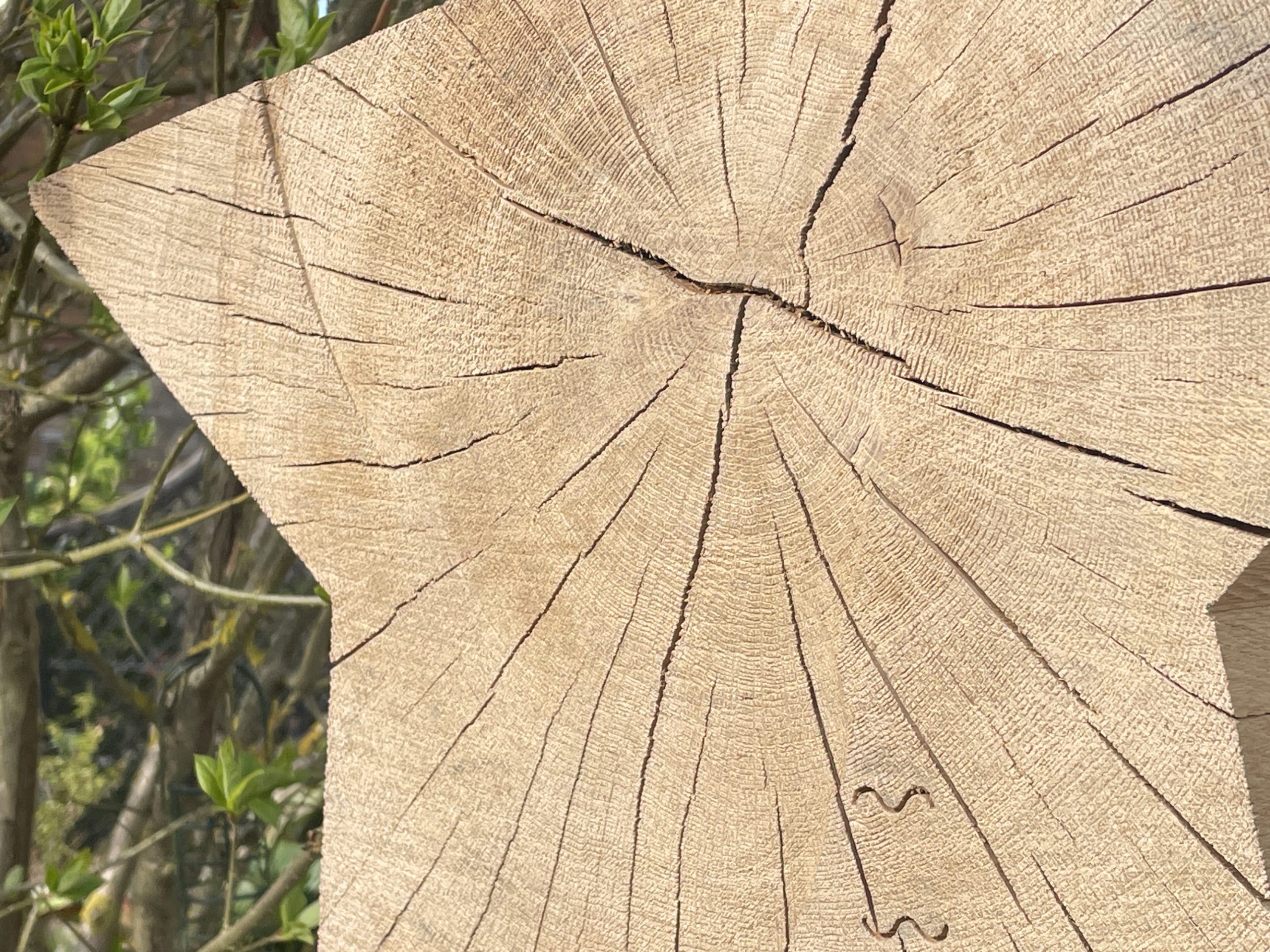 Bitte beachten: Holz ist ein natürlicher Werkstoff und kann bzw. wird nachtrocknen. Dieser Stern kann noch deutlich nachtrochen, dann auch Risse, auch deutliche Charakterrisse, aufzeigen können. Typischerweise bekommen diese Sterne neben vielen kleinen auch einen großen Hauptriss, der dann in Richtung Mitte weist.